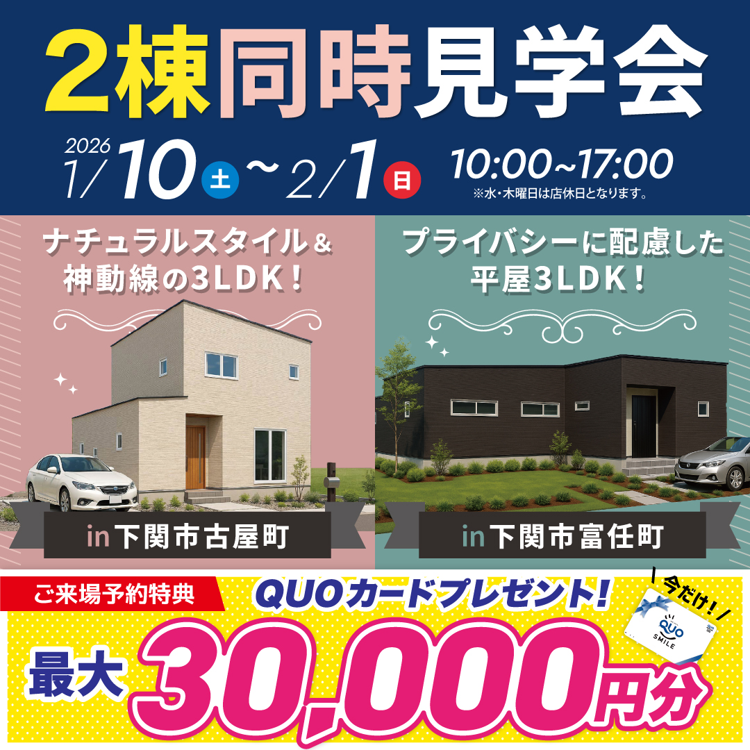 【下関市 富任町・古屋町】平屋と2階建てを一度に体感!2棟見比べ見学会