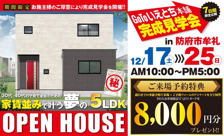 【防府市】子育て家族のための家賃並みで叶う夢の5LDK!牟礼で期間限定公開!