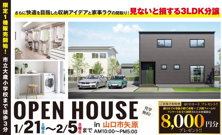 【山口市】吉敷に実用的な間取りの2階建て3LDKが4日間限定OPEN!