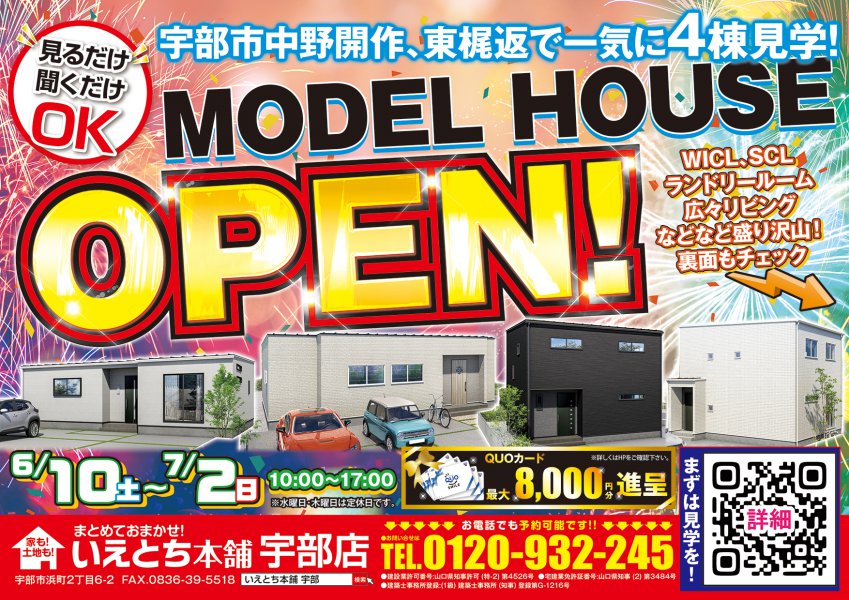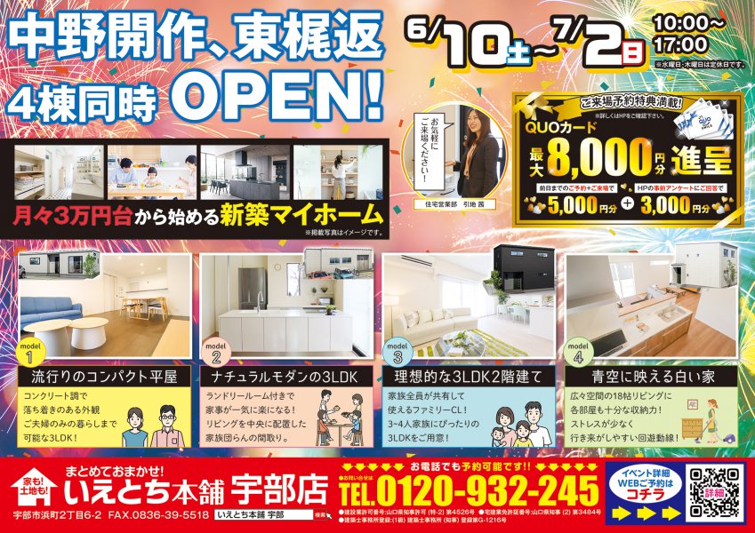 【宇部市】中野開作、東梶返で平屋と2階建てが見れる4棟同時見学会開催!