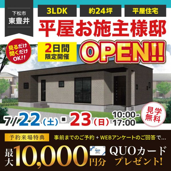 【周南店】2日間限定!下松市東豊井 平屋お施主様邸見学会 来場予約で最大1万円クオカードプレゼント
