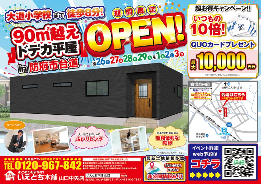 【防府市】90m²越えドデカ平屋が期間限定OPEN!今だけQUOカード10,000円分が貰えるチャンス!