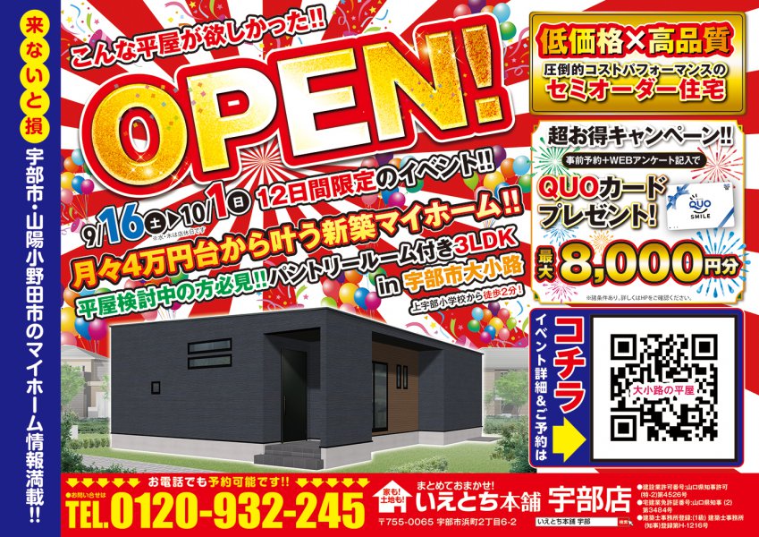 【宇部市】いよいよ大小路に平屋がOPEN!見た目もカッコいいこんな3LDK見るしかない!