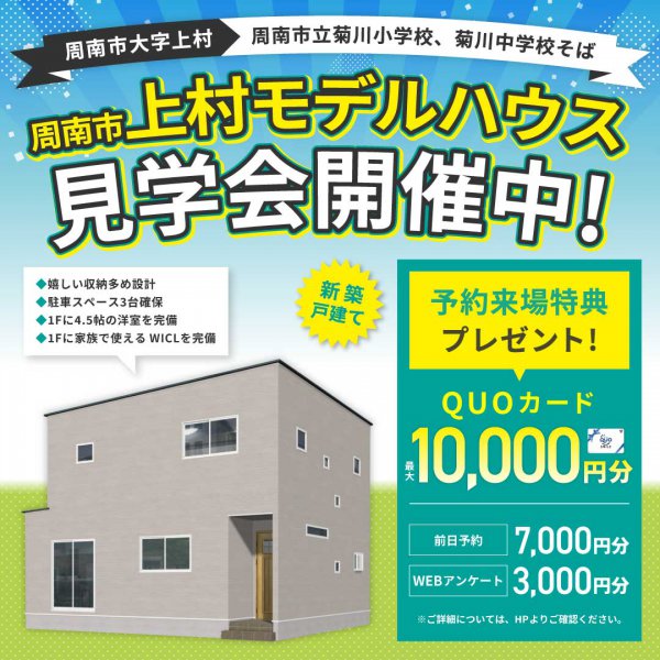 【周南店】上村Ⅱ分譲住宅 モデルハウス見学会!来場予約でクオカード1万円プレゼント