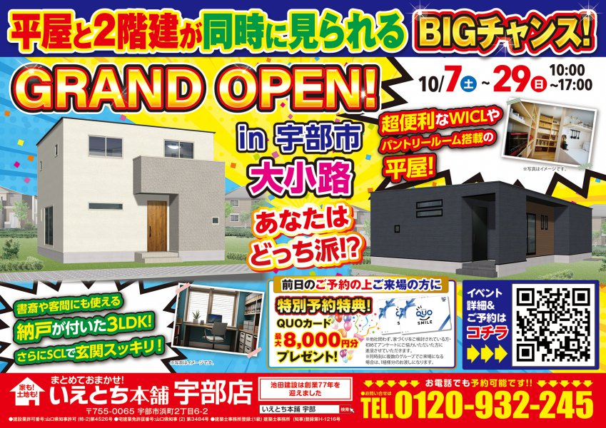 【宇部市】大小路で平屋と2階建てが見れる見学会!今だけQUOカード8,000円分プレゼントキャンペーン!