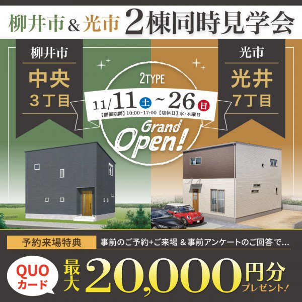 【周南店】柳井市&光市 2棟同時見学会!来場予約で2万円分クオカードプレゼント♪