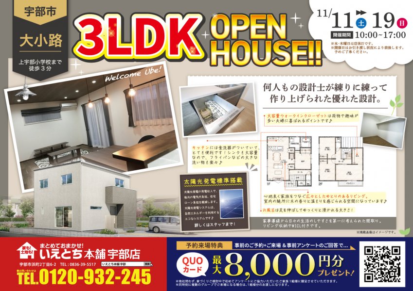 【宇部市】今ならQUOカード最大8,000円分プレゼント!2階建て3LDK見学会!