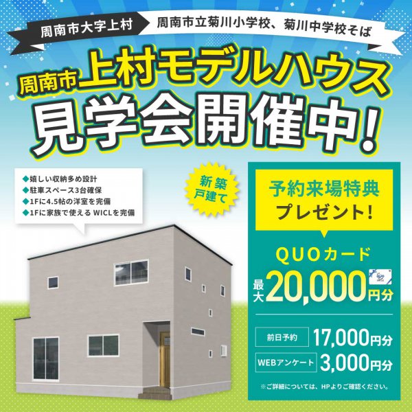 【周南店】上村Ⅱ分譲住宅 モデルハウス見学会!来場予約でクオカード2万円プレゼント