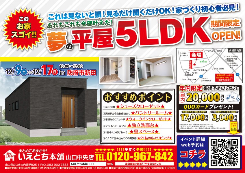 【防府市】このお家スゴイ!全部詰まった夢の平屋が期間限定OPEN!さらにQUOカード最大20,000円のチャンス!