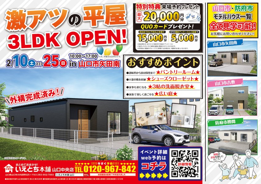 【山口市】外構完成!庭も広い3LDKの平屋がOPEN!今ならQUOカード最大20,000円