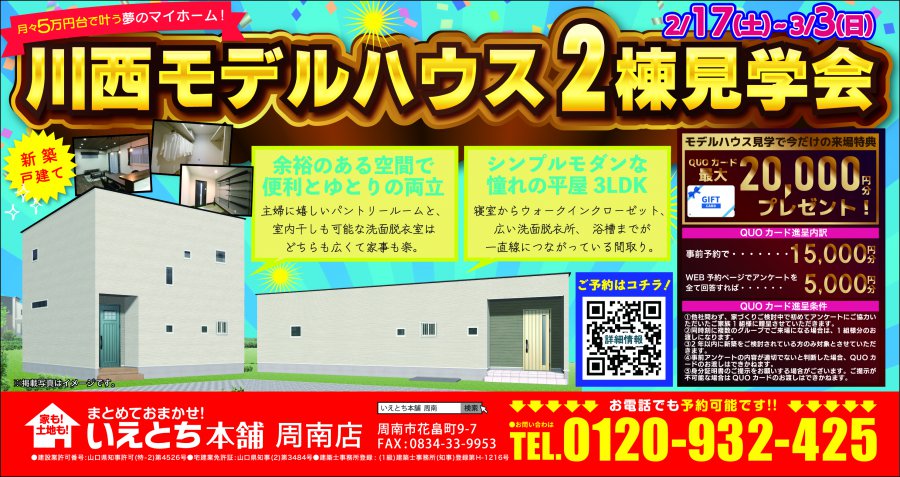 【岩国市】川西で豪華2棟見学会!今ならQUOカード最大20,000円!