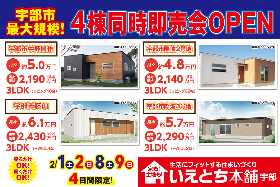 【宇部市最大規模】人気の平屋4棟同時即売会OPEN!