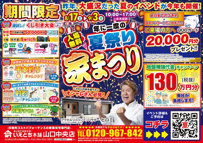 【山口中央店】毎年大好評!最大QUOカード20,000円が貰える夏祭りイベント