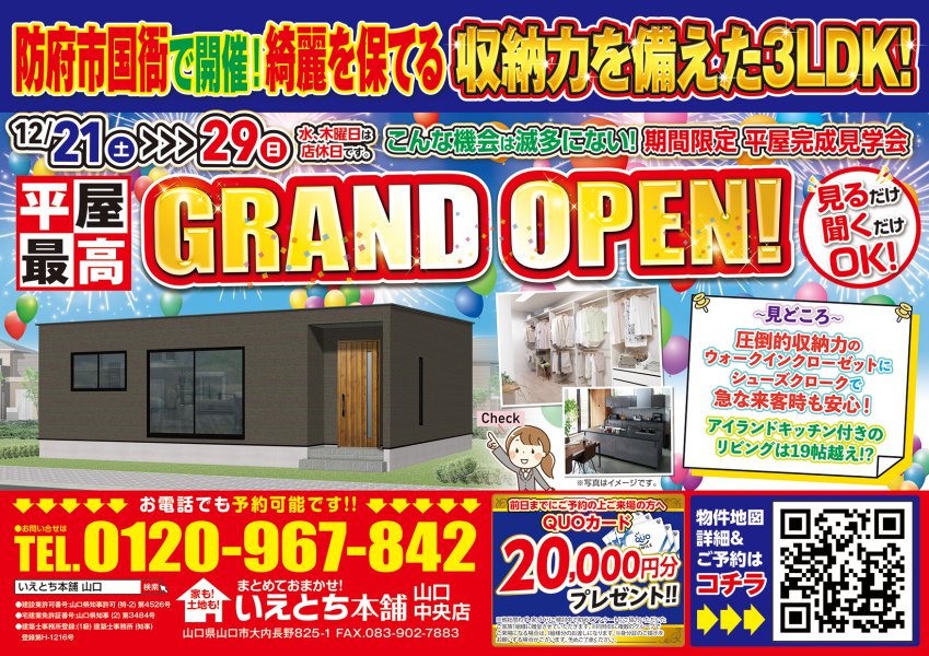 【25坪・防府市】キレイを保てる、収納力を備えた3LDK!防府市国衙で25坪平屋見学会開催!