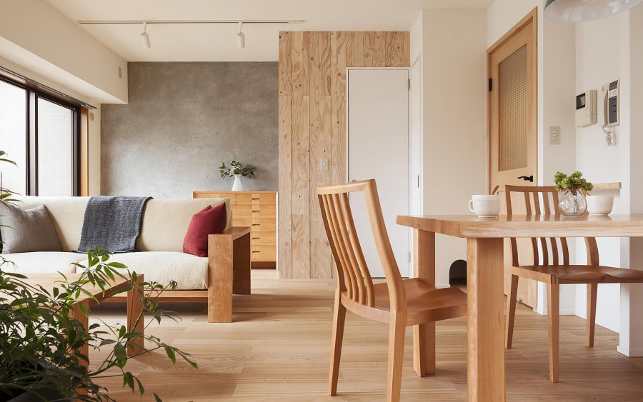 フローリングがグレージュで落ち着きのあるリビングへ