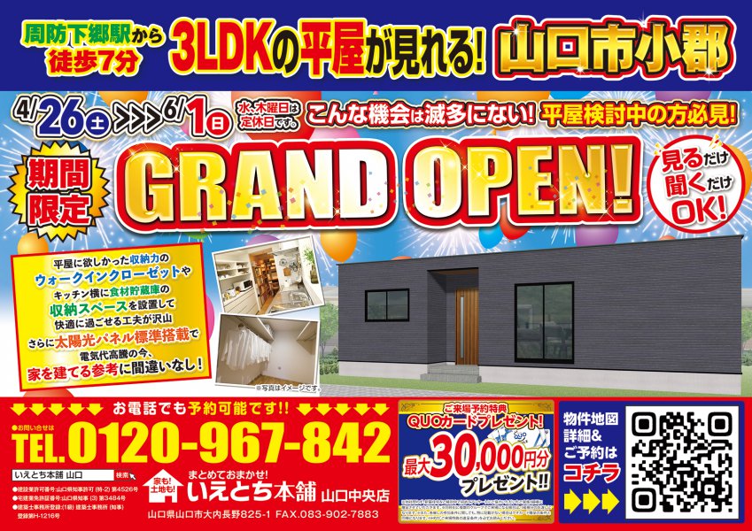 【山口市】周防下郷駅から徒歩7分!で平屋3LDK分譲住宅見学会OPEN!
