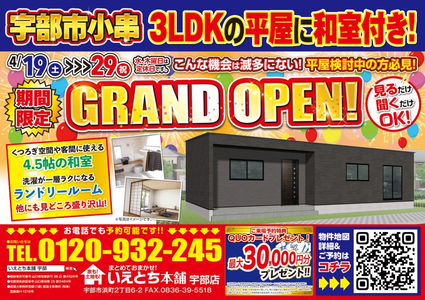【宇部市】3LDKの平屋に和室付き!宇部市小串で必見の見学会がOPEN!