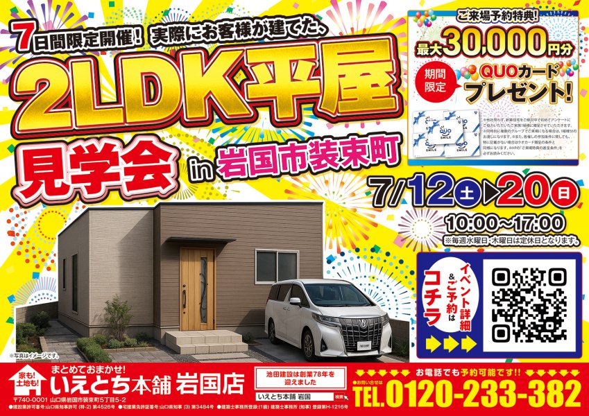 【岩国市】新築をご検討中の方必見!岩国市装束町でコンパクトかつ収納力抜群な平屋見学会開催!