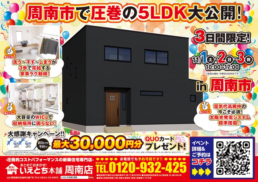 【周南市】期間限定!5LDKモデルハウス見学会|趣味スペースもばっちり確保できる、ゆとりのある間取り