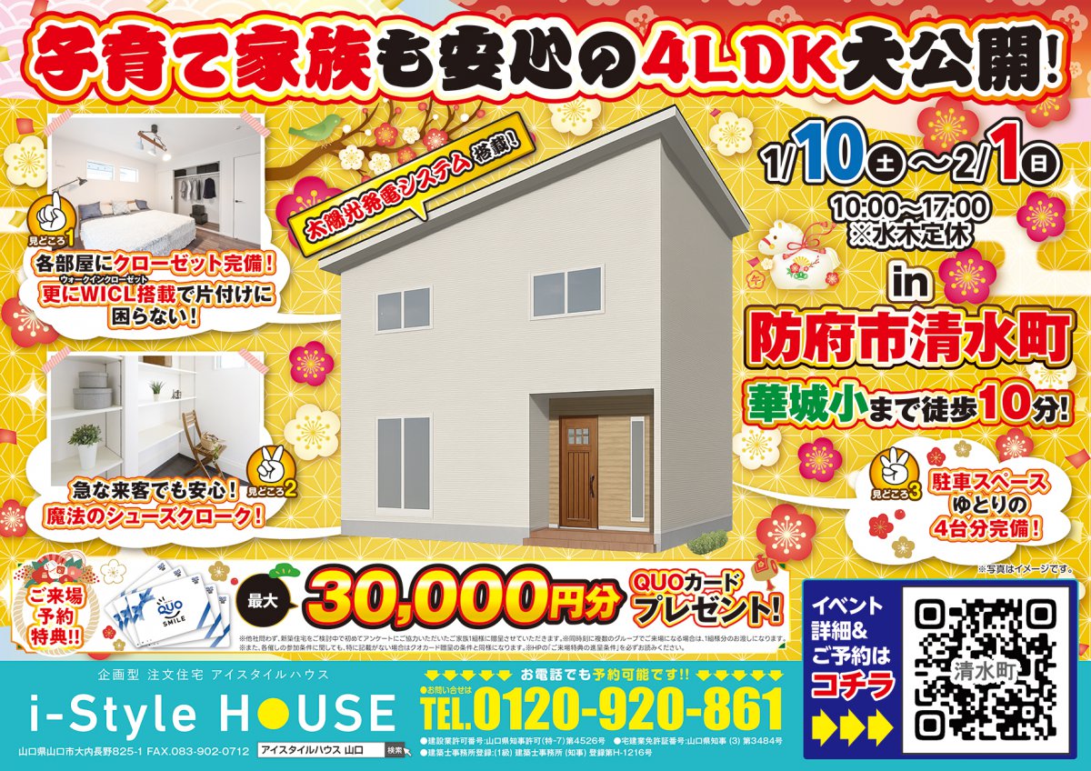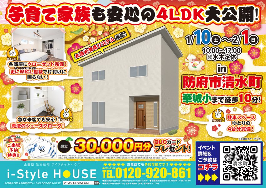 【i-Style HOUSE】防府市清水町モデルハウス見学会開催!今だけ最大30,000円分のQUOプレゼント♪
