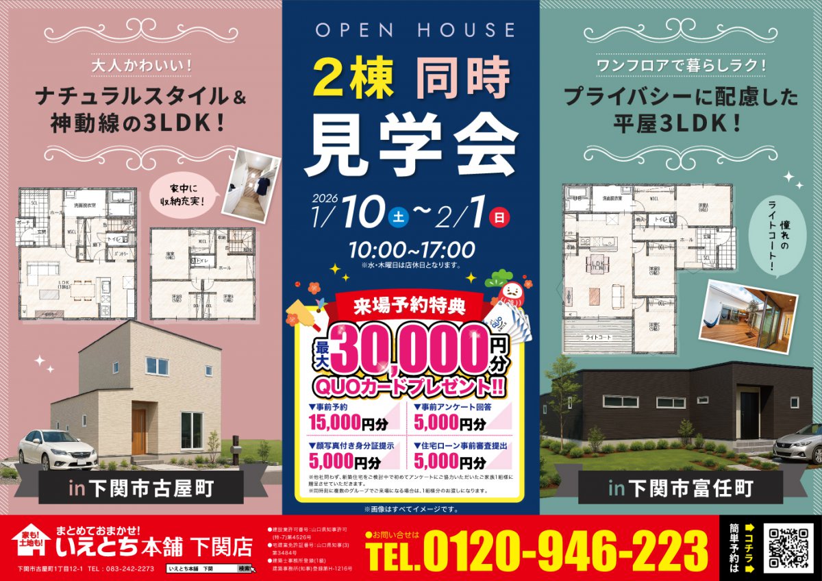 【下関市 富任町・古屋町】平屋と2階建てを一度に体感!2棟見比べ見学会
