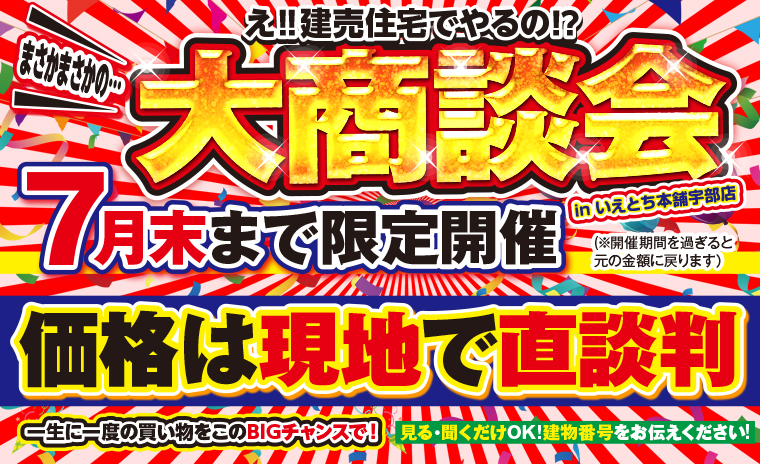 | 場所 | 各物件の現地 (いえとち本舗宇部店の店舗に直接来場も可能) | 時間 | 10:00~17:00 |