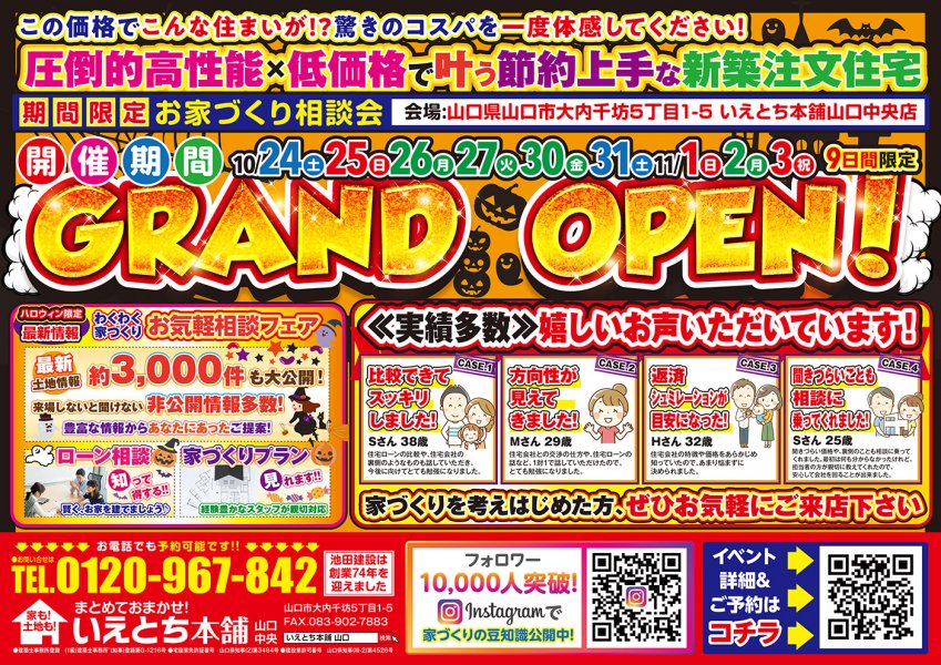 | 場所 | 山口県山口市大内千坊5丁目1-5 いえとち本舗山口中央店 (MAP) | 時間 | 10:00~17:00 |