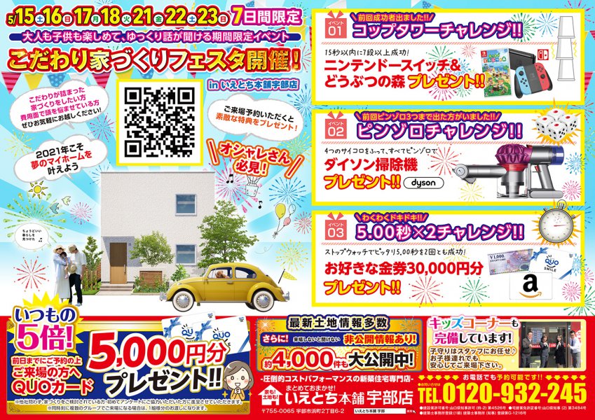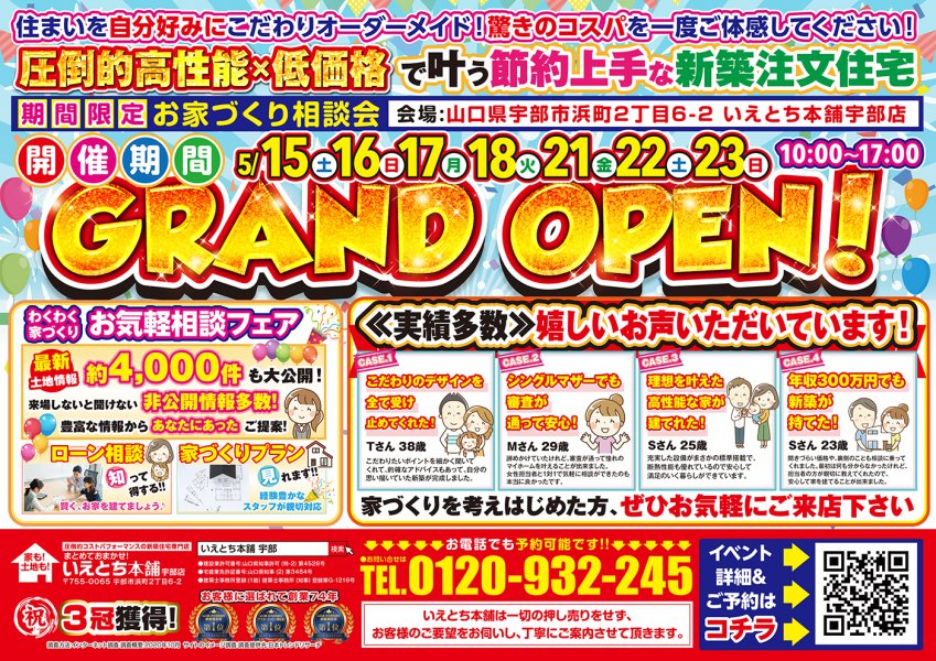| 場所 | 山口県宇部市浜町2丁目6−2 いえとち本舗宇部店 (MAP) | 時間 | 10:00~17:00 |