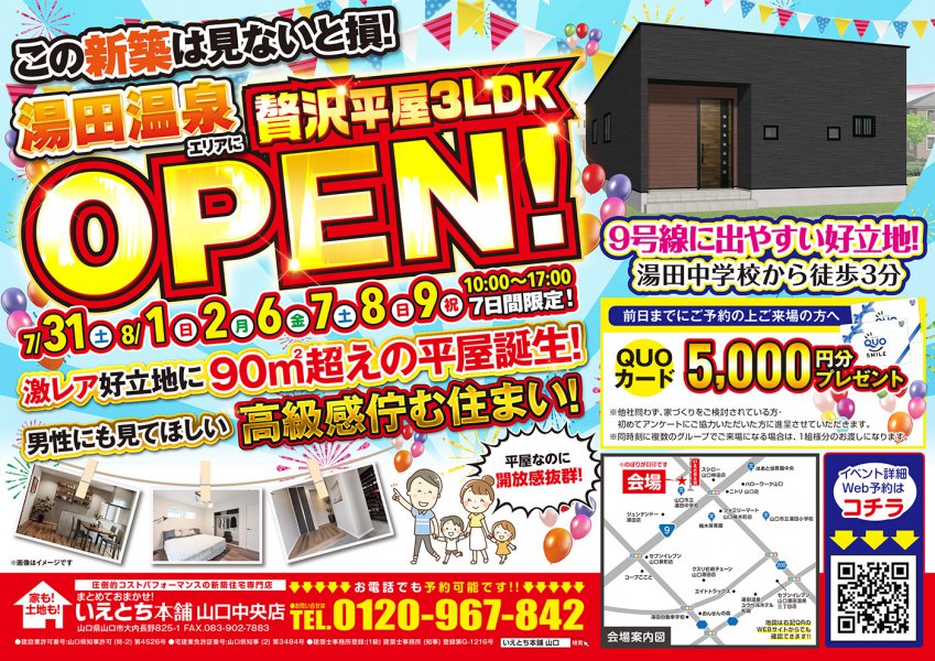 【山口市湯田温泉エリア】この新築は見ない損!激レア好立地に贅沢平屋誕生!