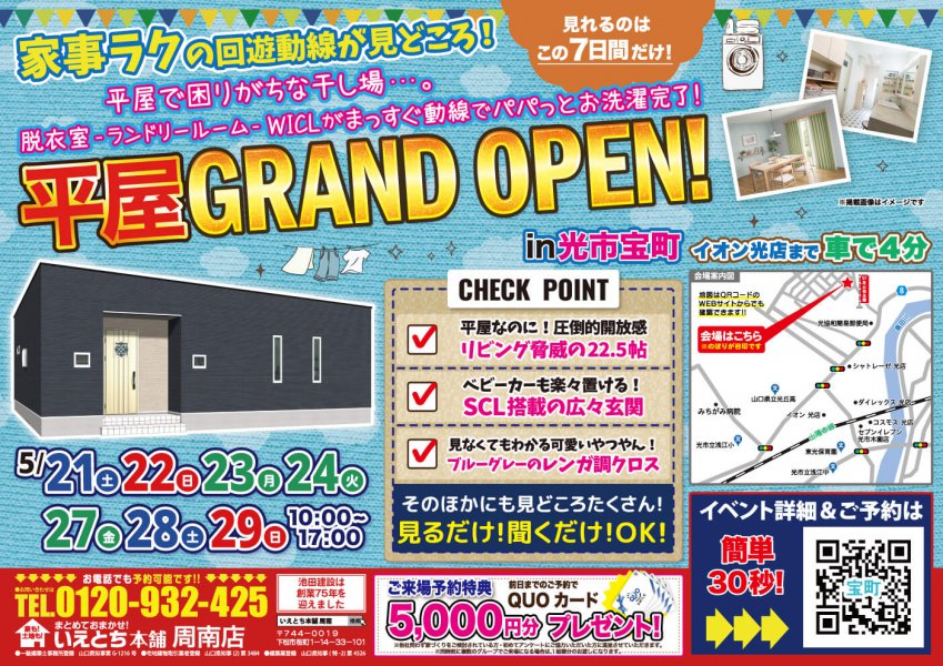 回遊動線を取り入れた家事ラク平屋ハウス GRAND OPEN!in光市宝町