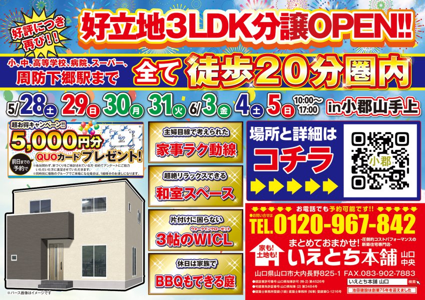 【小郡山手上】小中高、病院、スーパー、駅まで徒歩20分以内!和室、WICL付き3LDKがOPEN!