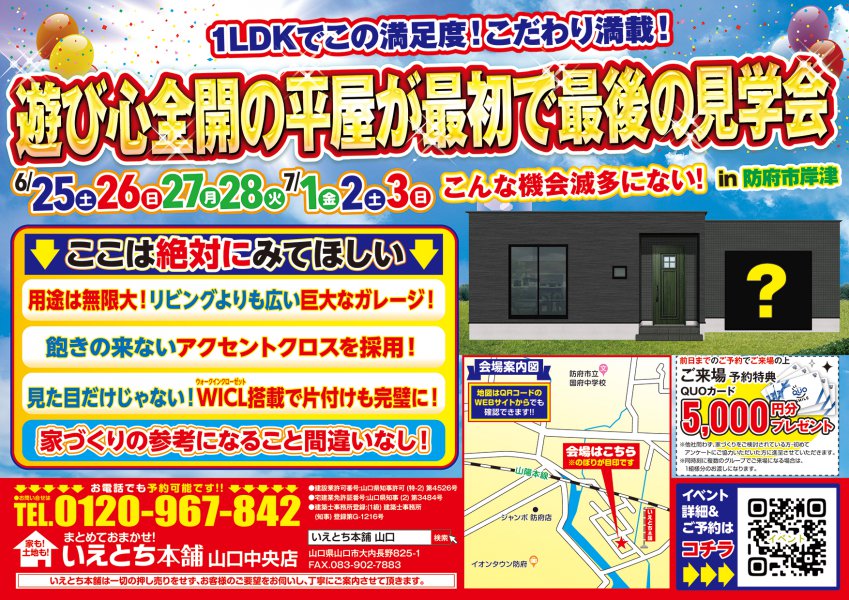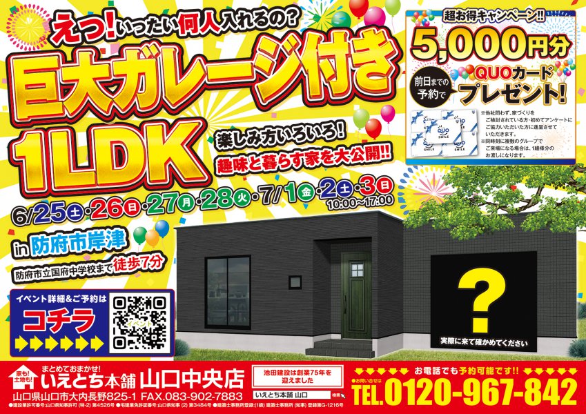 【防府市】巨大ガレージ付き遊び心全開の平屋が最初で最後の見学会開催!