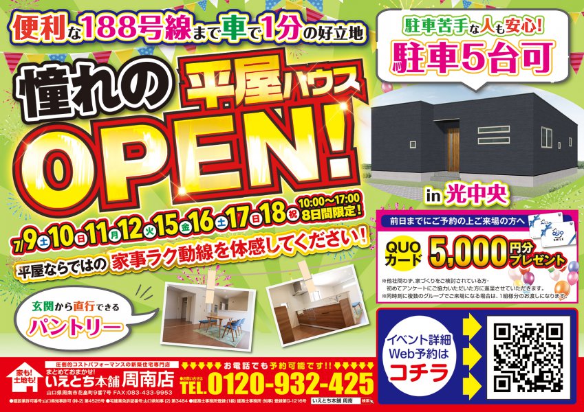 【光中央】5台以上駐車できるほど広い敷地!憧れの平屋3LDKハウス OPEN