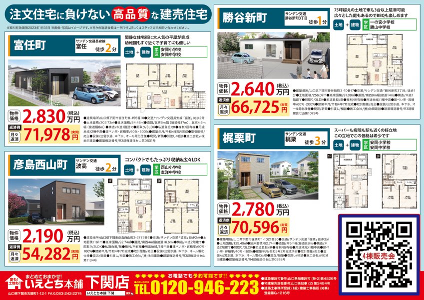 ●建築場所/山口県下関市梶栗町1-1021番30●交通/サンデン交通「梶栗」徒歩3分●土地面積/139.49㎡●延床面積/92.74㎡●道路/南6m幅(接道8.8m)●構造/木造2階建て●間取り/3LDK●私道負担/無●権利/所有権●用途地域/1種中高●建ぺい率・容積率/40%・160%●建築年月/令和5年2月完成予定●取引態様/売主●設備/公営水道、本下水、オール電化仕様●現況/新築●引渡し/相談●施工会社/(株)池田建設●建築確認番号/R4建確建住セ山第0598号