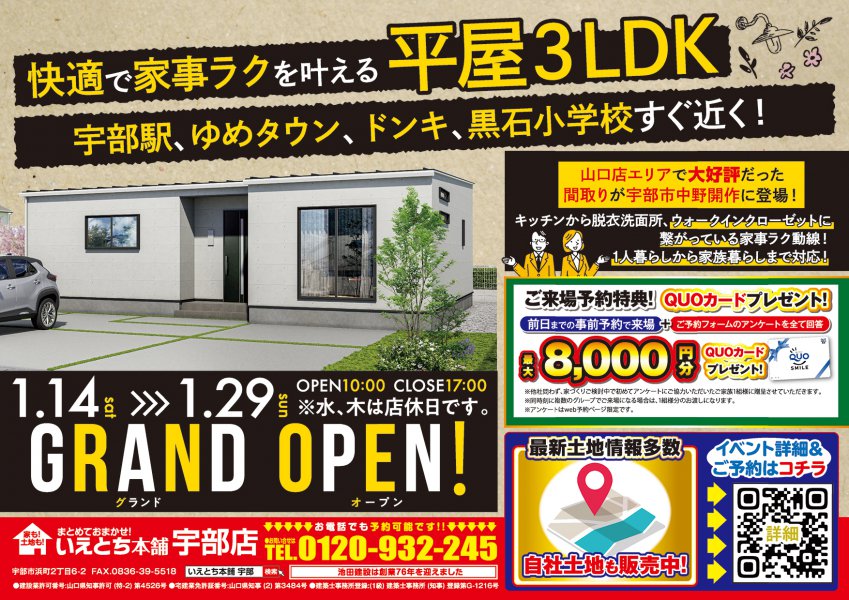 【宇部市】駅、小学校、スーパーまですぐ近く!平屋で人気の間取りを取り入れた新築3LDK!