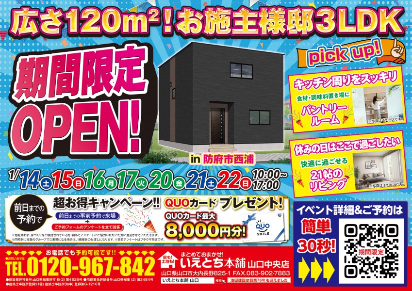 【防府市】広さ120m²!お施主様邸3LDKが期間限定OPEN!