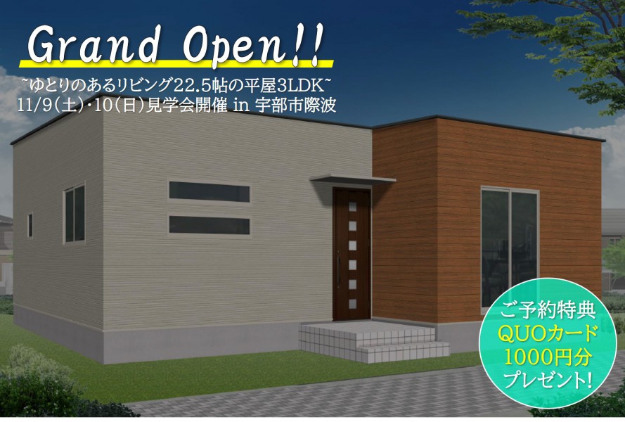11月9日(土)・10日(日)に宇部市際波で大好評の平屋3LDKのモデルハウスがOPEN!!