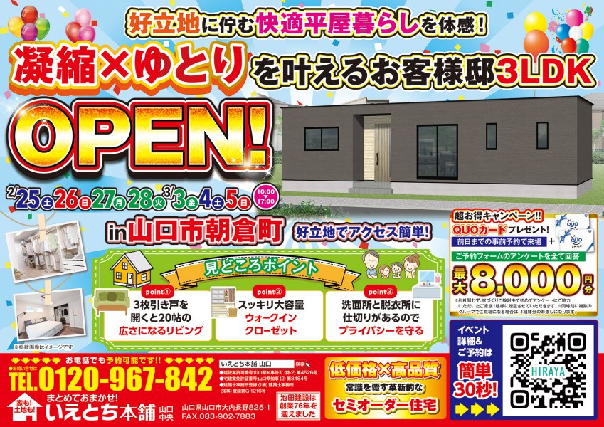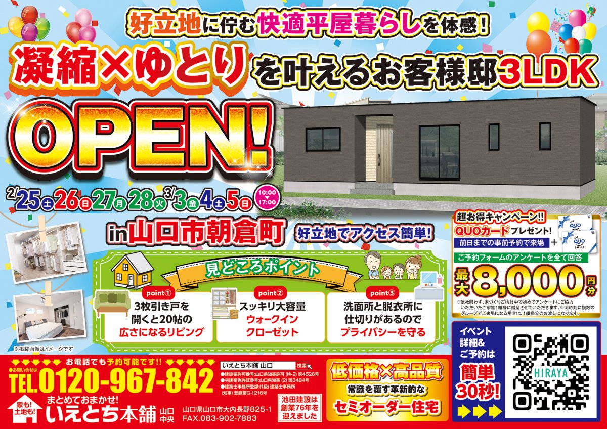 【山口市】好立地に佇む快適な平屋暮らしを体感!朝倉町でお施主様邸3LDK完成見学会開催!