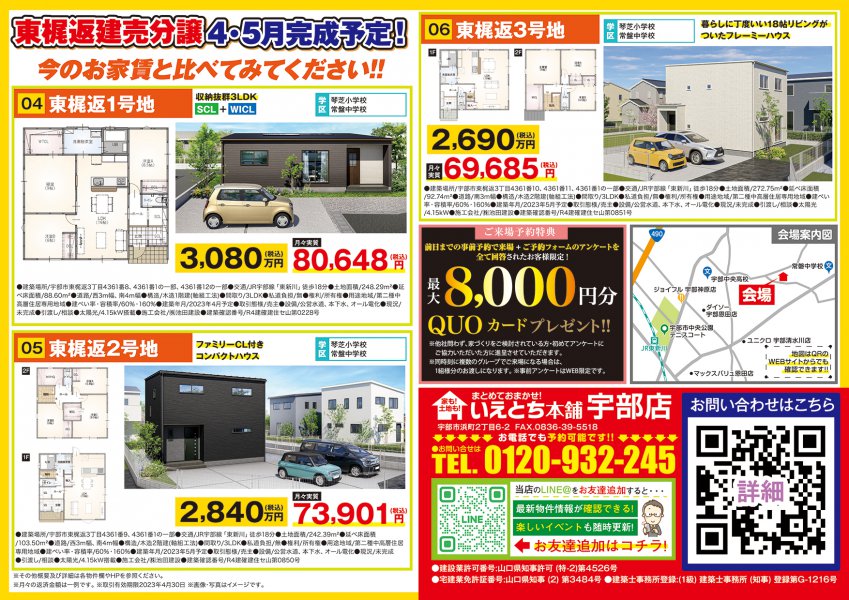 ●建築場所/宇部市東梶返3丁目4361番9、4361番1の一部●交通/JR宇部線「東新川」徒歩18分●土地面積/242.39m²●延べ床面積/103.50m²●道路/西3m幅、南4m幅●構造/木造2階建(軸組工法)●間取り/3LDK●私道負担/無●権利/所有権●用途地域/第二種中高層住居専用地域●建ぺい率・容積率/60%・160%●建築年月/2023年5月予定●取引態様/売主●設備/公営水道、本下水、オール電化●現況/未完成●引渡し/相談●太陽光/4.15kW搭載●施工会社/㈱池田建設●建築確認番号/R4建確建住セ山第0850号