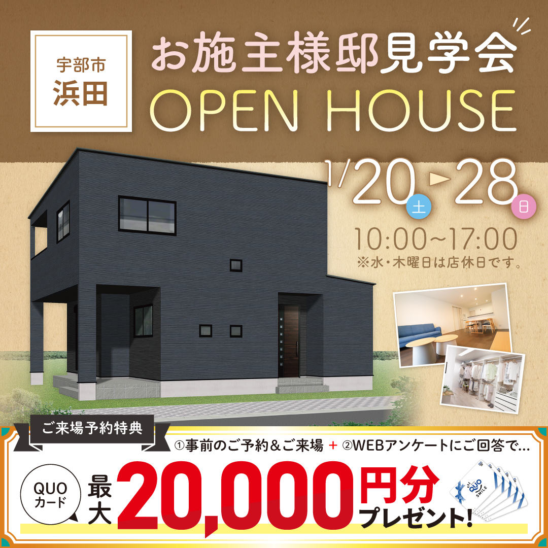 【宇部市】浜田でお施主様邸見学会!来場予約でクオカード2万円プレゼント