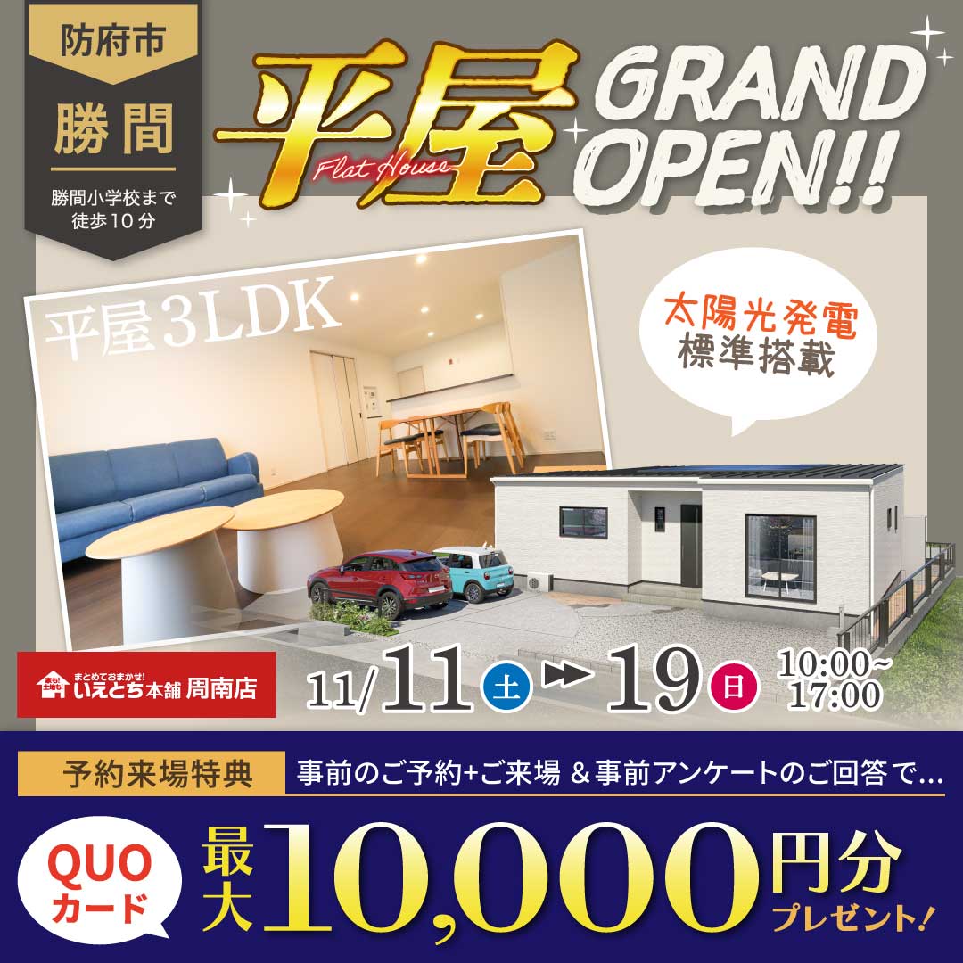 【防府市】今ならQUOカード最大10,000円分→最大20,000円分プレゼント!平屋OPEN!