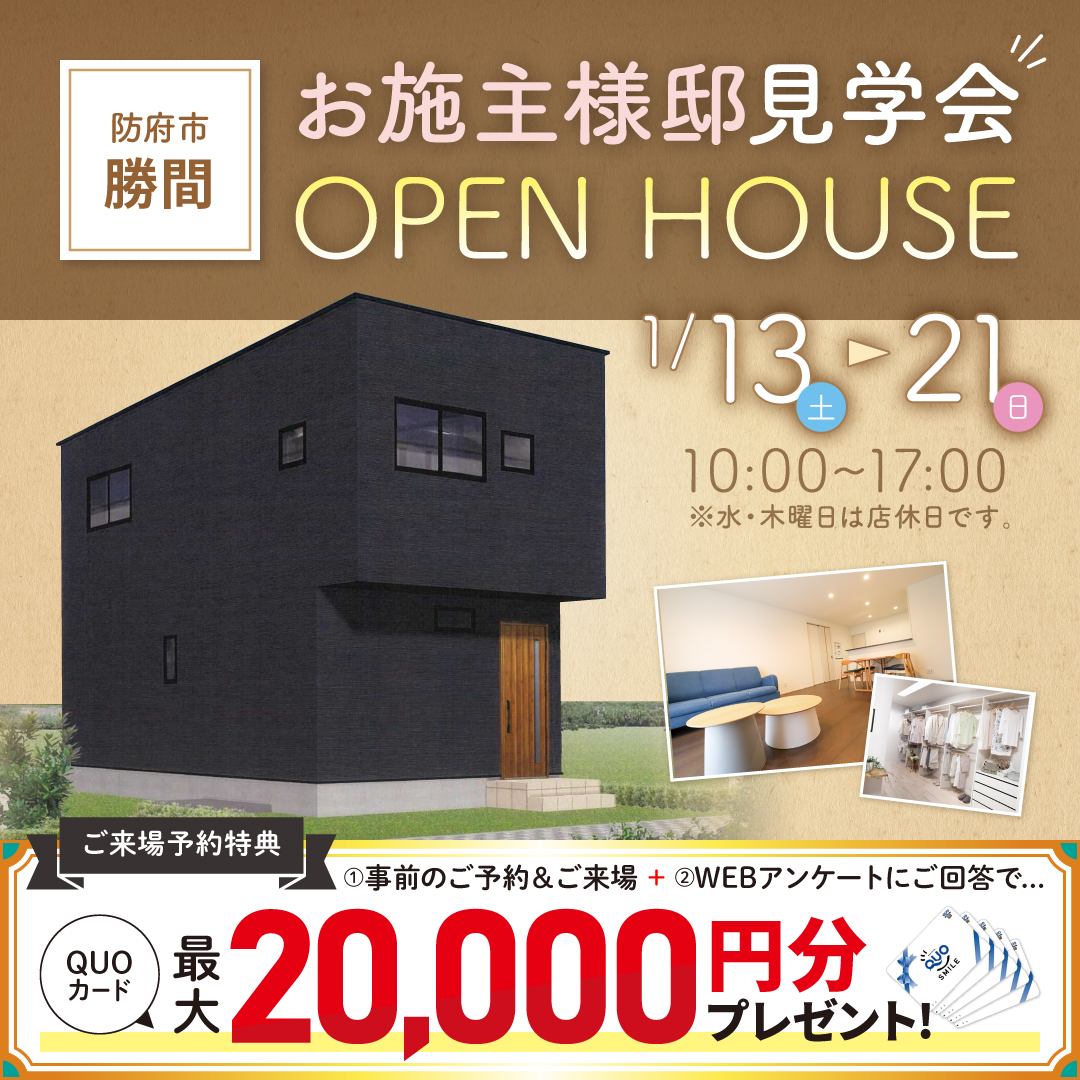 【防府市】勝間でお施主様邸見学会!来場予約でクオカードプレゼント