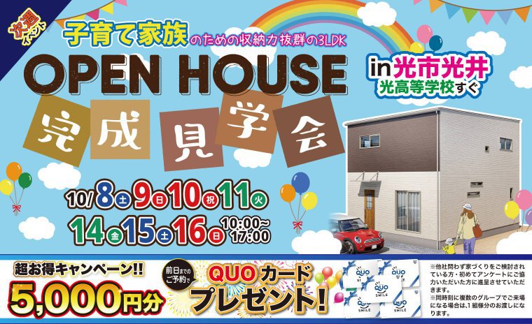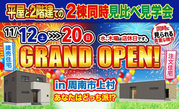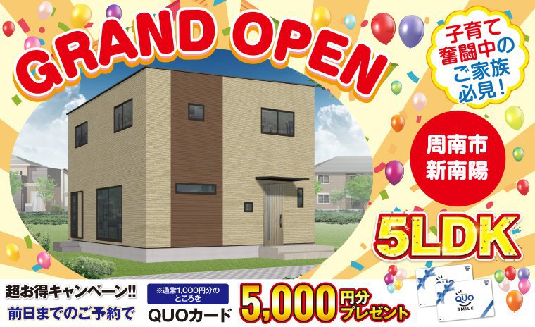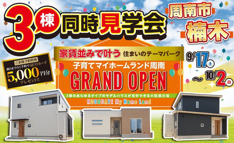 【周南市楠木】人気エリアで3棟同時見学会 GRAND OPEN!