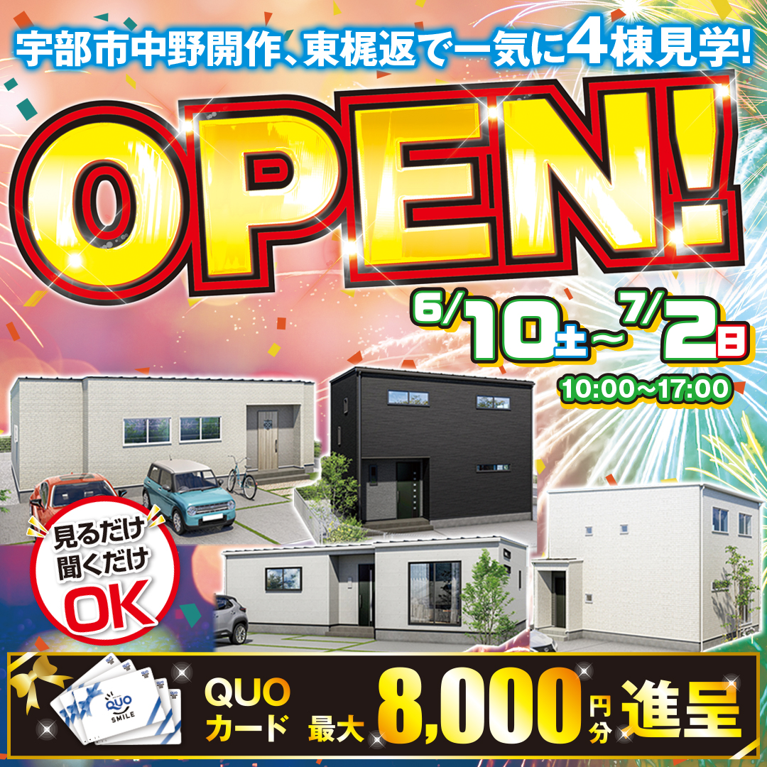 【宇部市】中野開作、東梶返で平屋と2階建てが見れる4棟同時見学会開催!