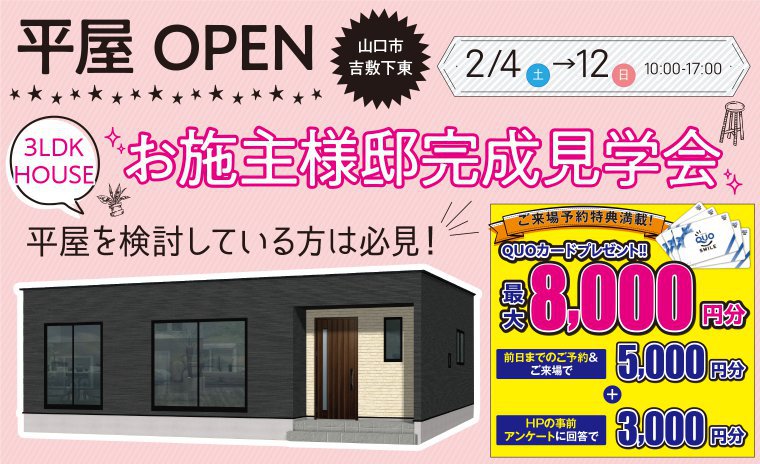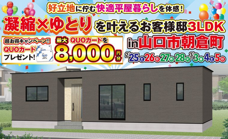 【山口市】好立地に佇む快適な平屋暮らしを体感!朝倉町でお施主様邸3LDK完成見学会開催!