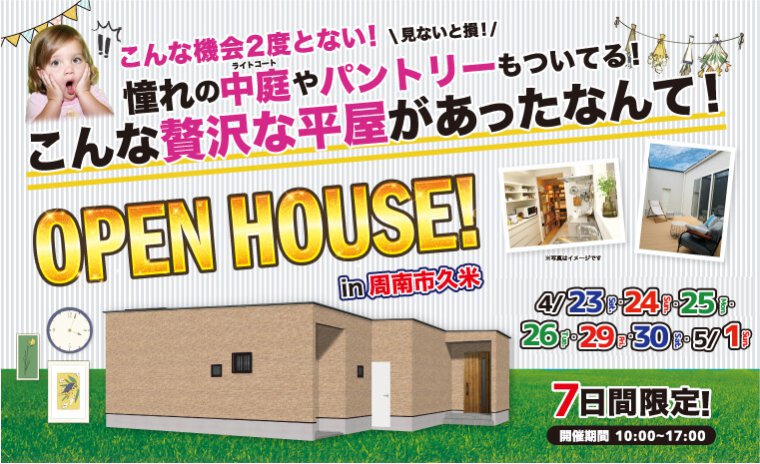 こんな機会2度とない!憧れの中庭にパントリーもついた平屋3LDK OPEN HOUSEin周南市久米