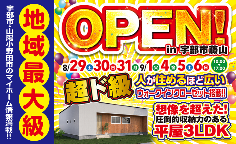 【宇部市藤山】超巨大ウォークインクローゼット搭載のモデルハウスOPEN!