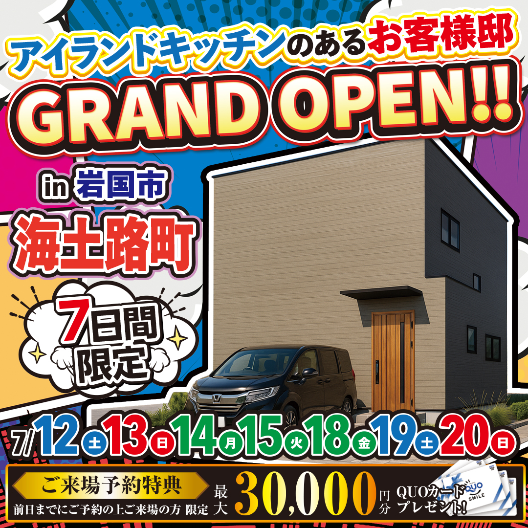 【岩国市】憧れのアイランドキッチン!7日間限定で、岩国市海土路町に2階建て見学会OPEN!