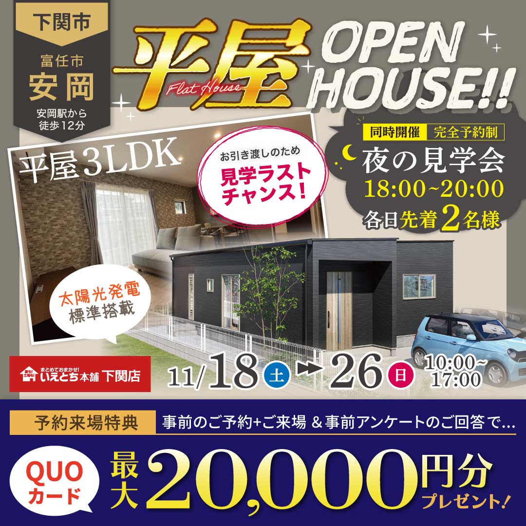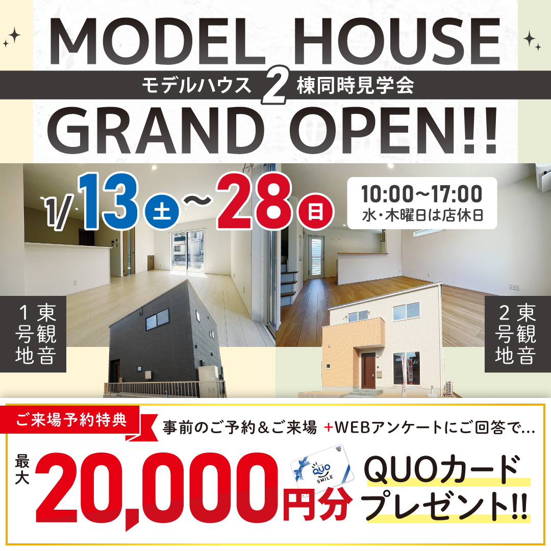 【下関店】東観音モデルハウス見学会!期間限定来場予約でクオカード2万円♪