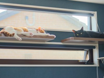 窓辺のキャットウォークで気持ちよさそうにお昼寝をする猫ちゃん達。